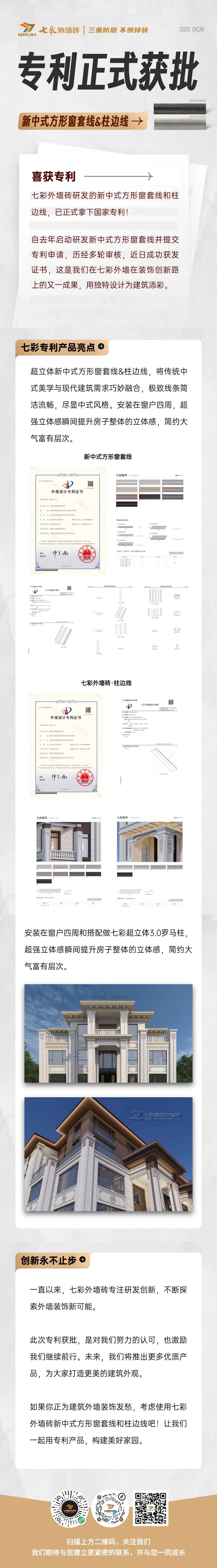 七彩外墙砖研发的新中式方形窗套线和柱边线,已正式拿下国家专利!